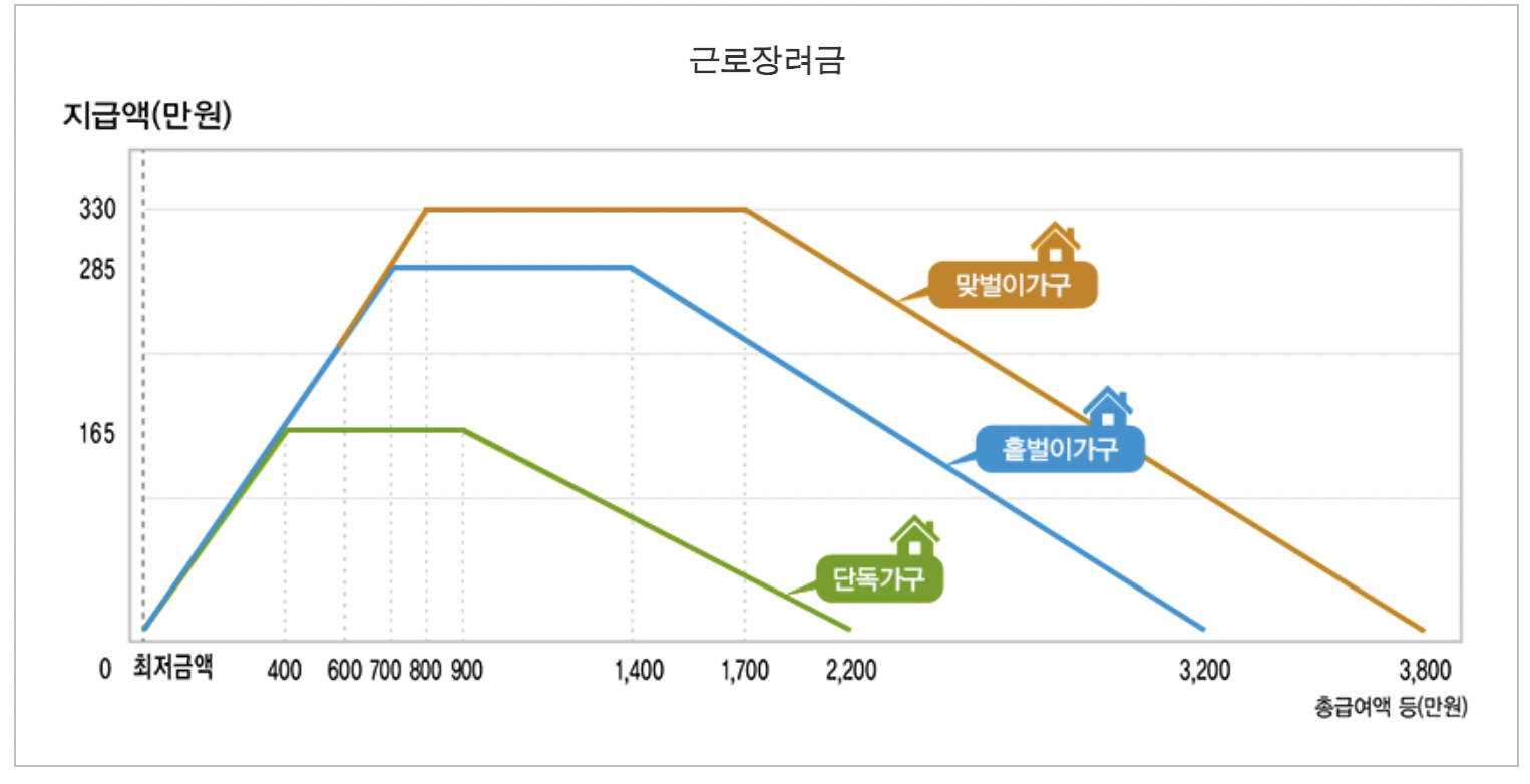 일은 하지만 소득이 적어 생활이 어려운 근로자, 사업자(전문직 제외)가구에 대하여 가구원 구성과 근로소득, 사업소득 또는 종교인소득에 따라 산정된 근로장려금을 지급함으로써 근로를 장려하고 실질소득을 지원하는 근로연계형 소득지원 제도
